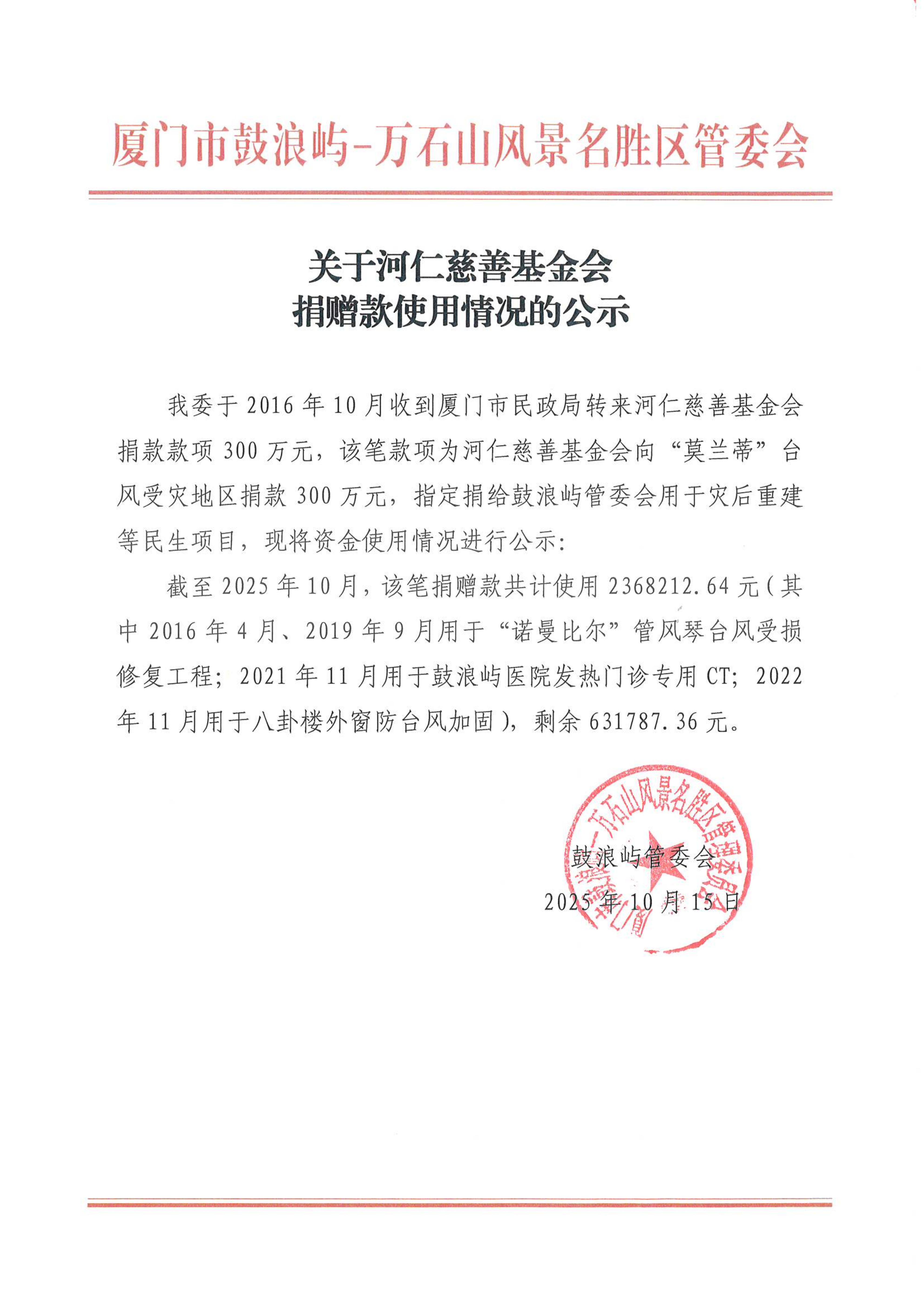 鼓浪屿管委会关于河仁慈善基金会捐赠款使用情况的公示